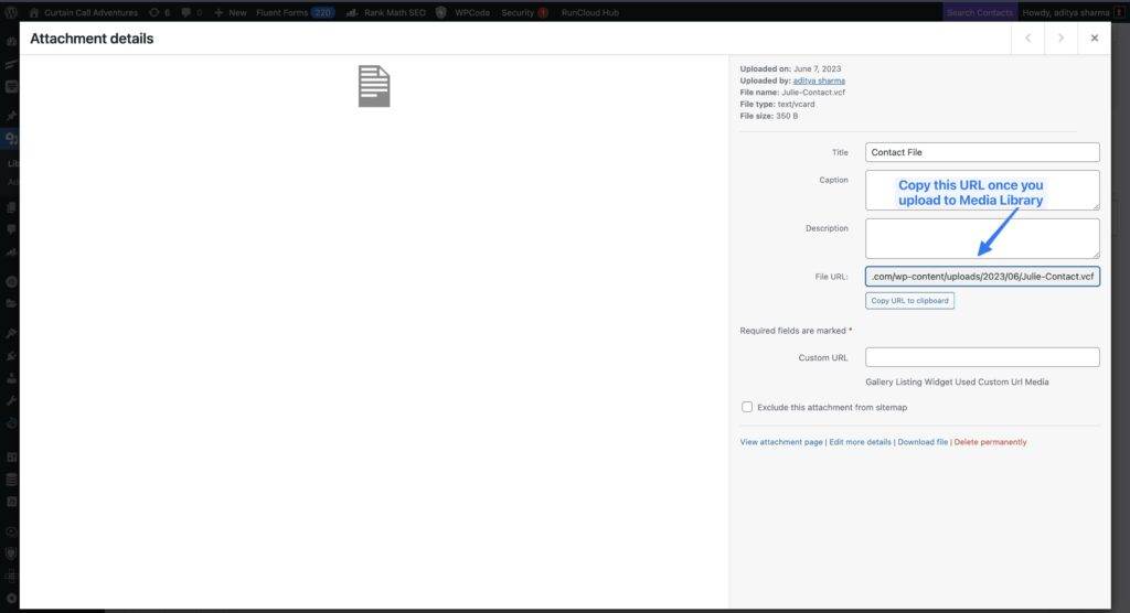 Next copy this URL, of VCF file from your Media library and paste it on the button, where you want your visitors to download the VCF contact file.