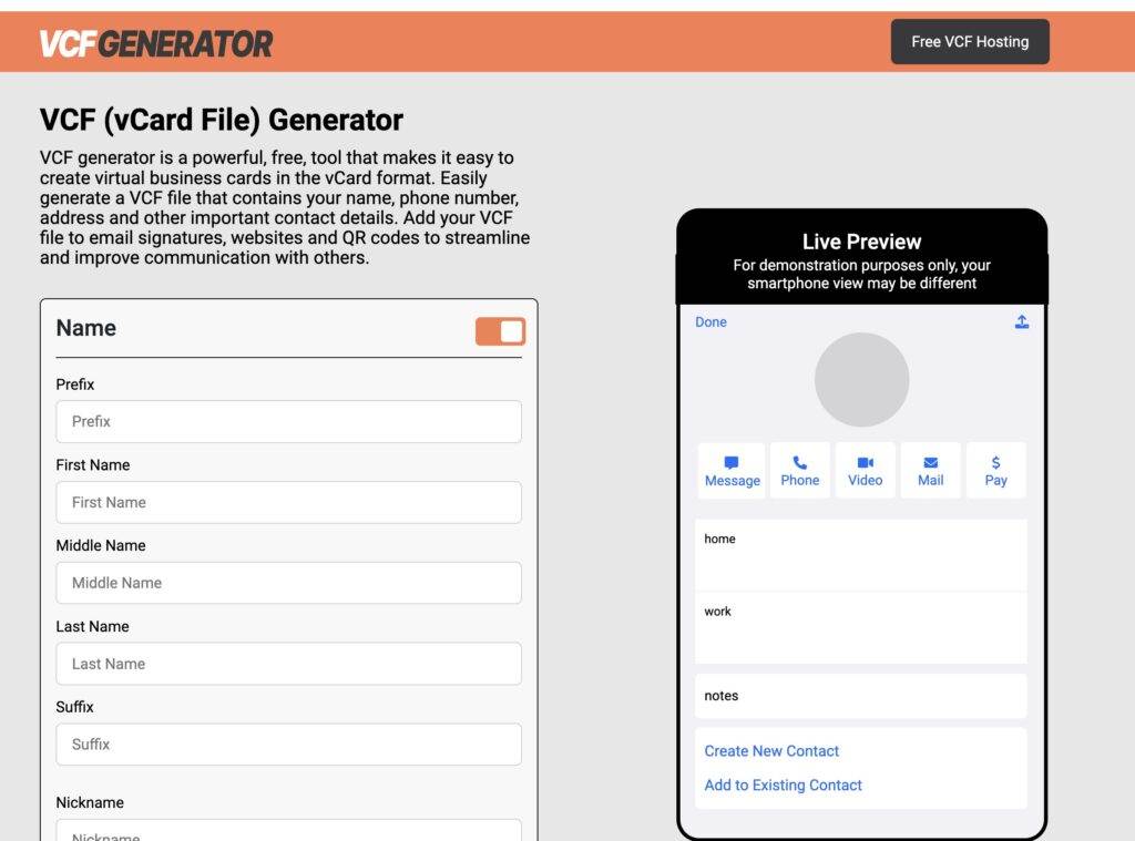 Next to create a virtual business card in the vCard format, [VCFgenerator](https://www.vcfgenerator.com/) is a powerful and free tool that can help.